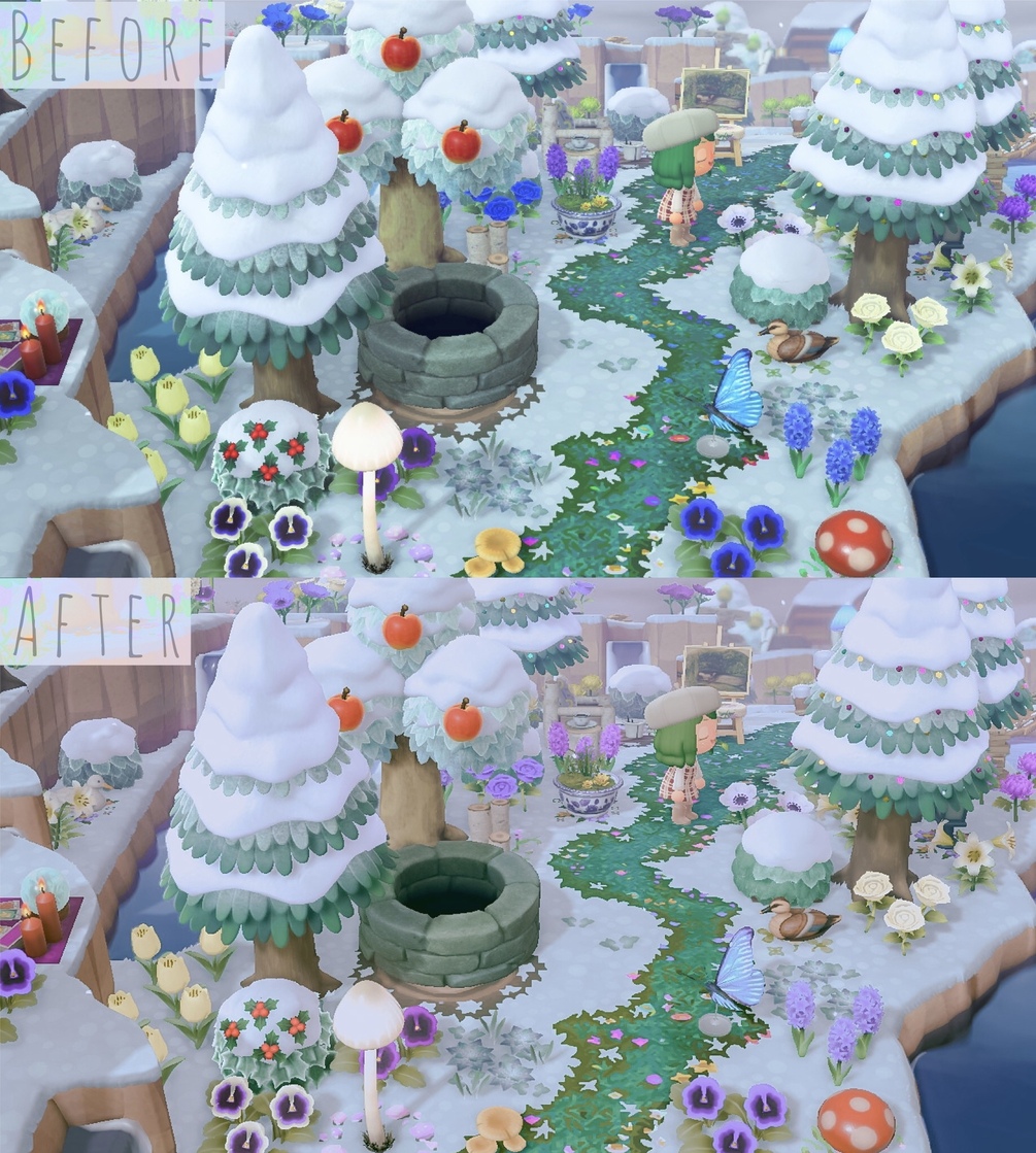 ‘Fairytale’ is an Animal Crossing Lightroom preset that is inspired by fairytales and all things whimsical. It softens your island photos, bringing out a peachy hue and makes greens more mellow-yellow. This magical preset is perfect for November photos but also works amazing for Winter photos too (& interior photos)! 🧚🏻♀️✨🍑🌸❄️